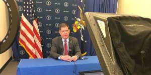 Secretary of Labor Walsh is shown being interviewed for a TV news program from the Department of Labor in Washington, D.C. DOL photo US Labor Secretary Marty Walsh spoke to …